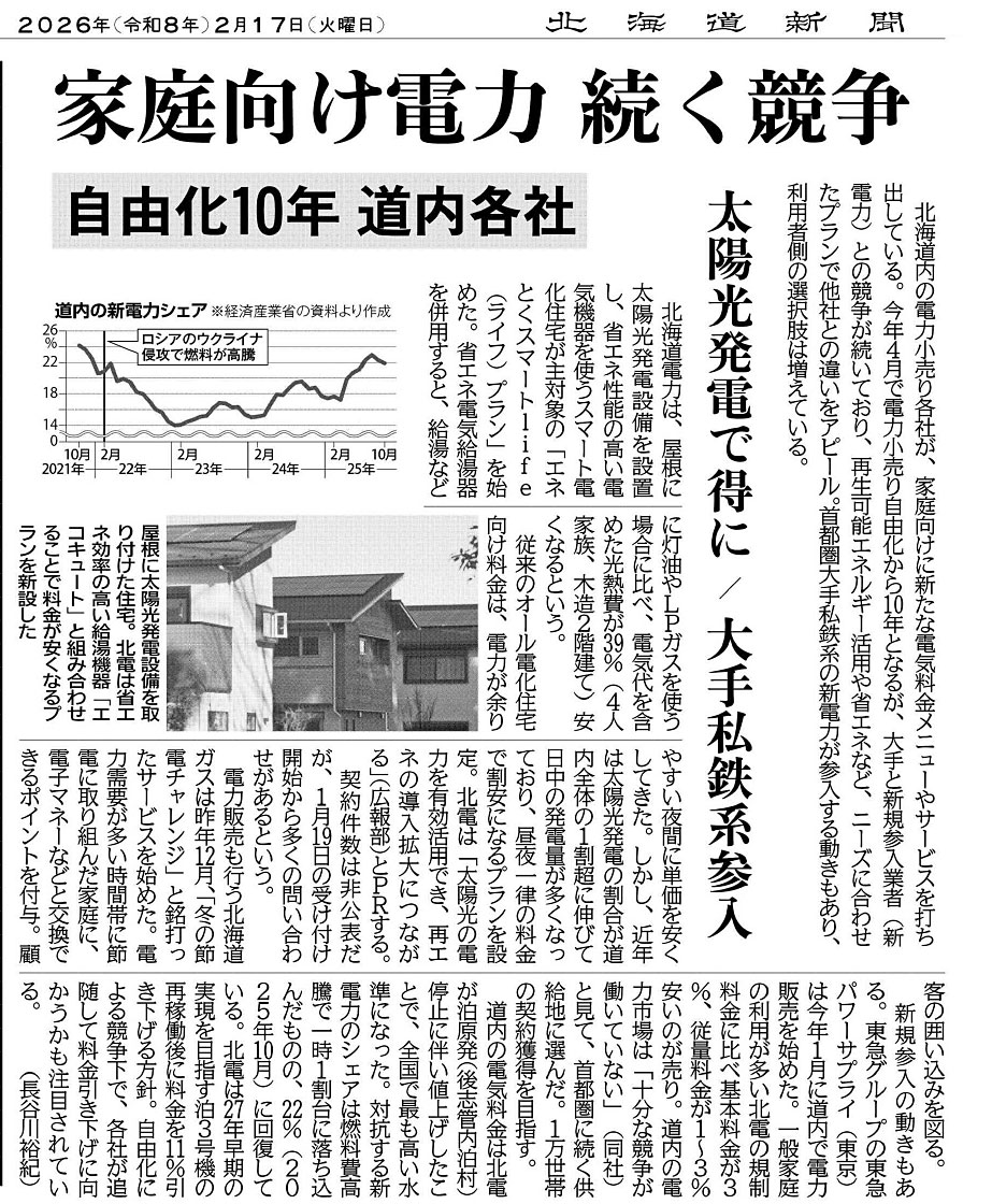 新聞記事のように十分な競争をして日本一高い!北海道の電気代が安くなってほしいです。